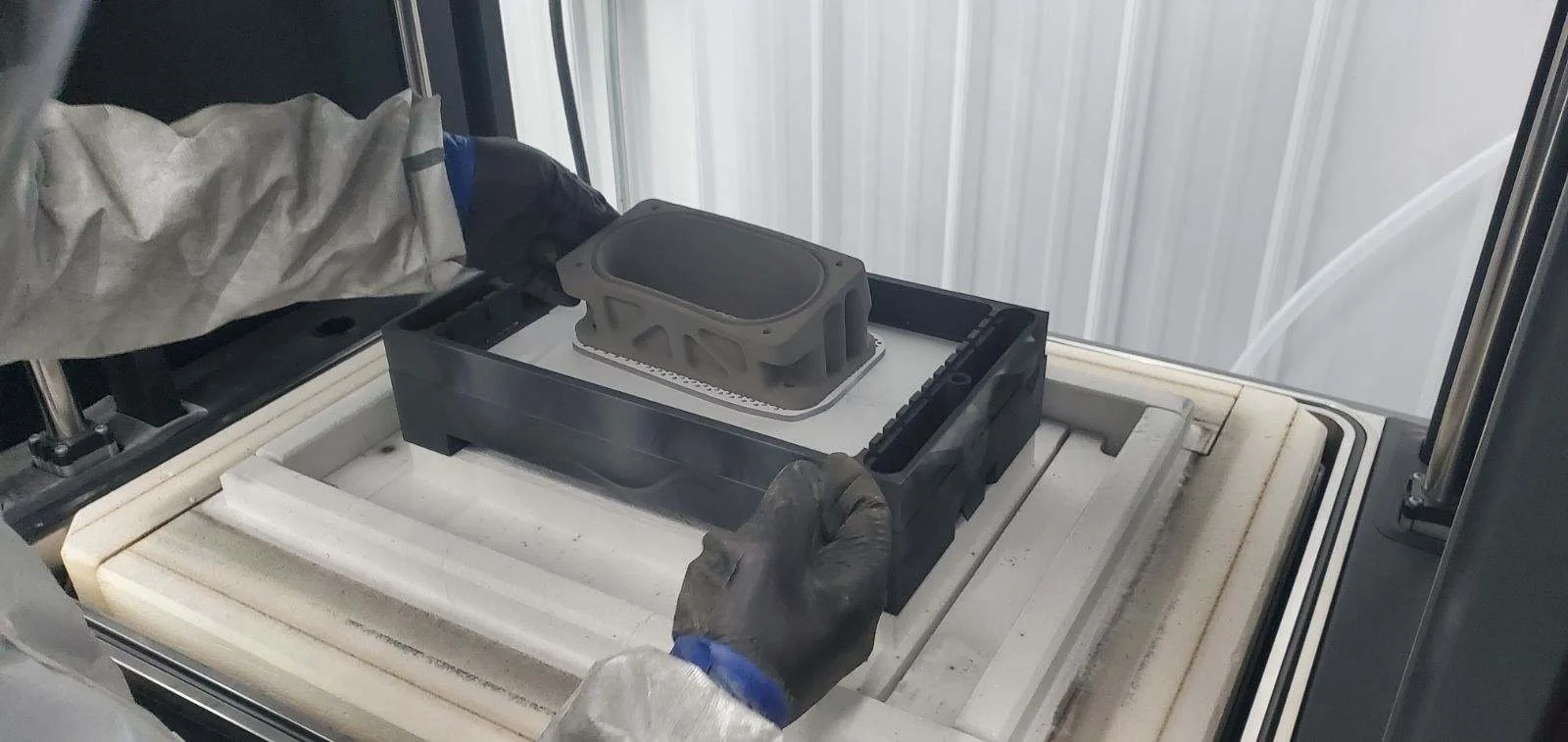 Taking the metal printed throttle body out of the sintering furnace.