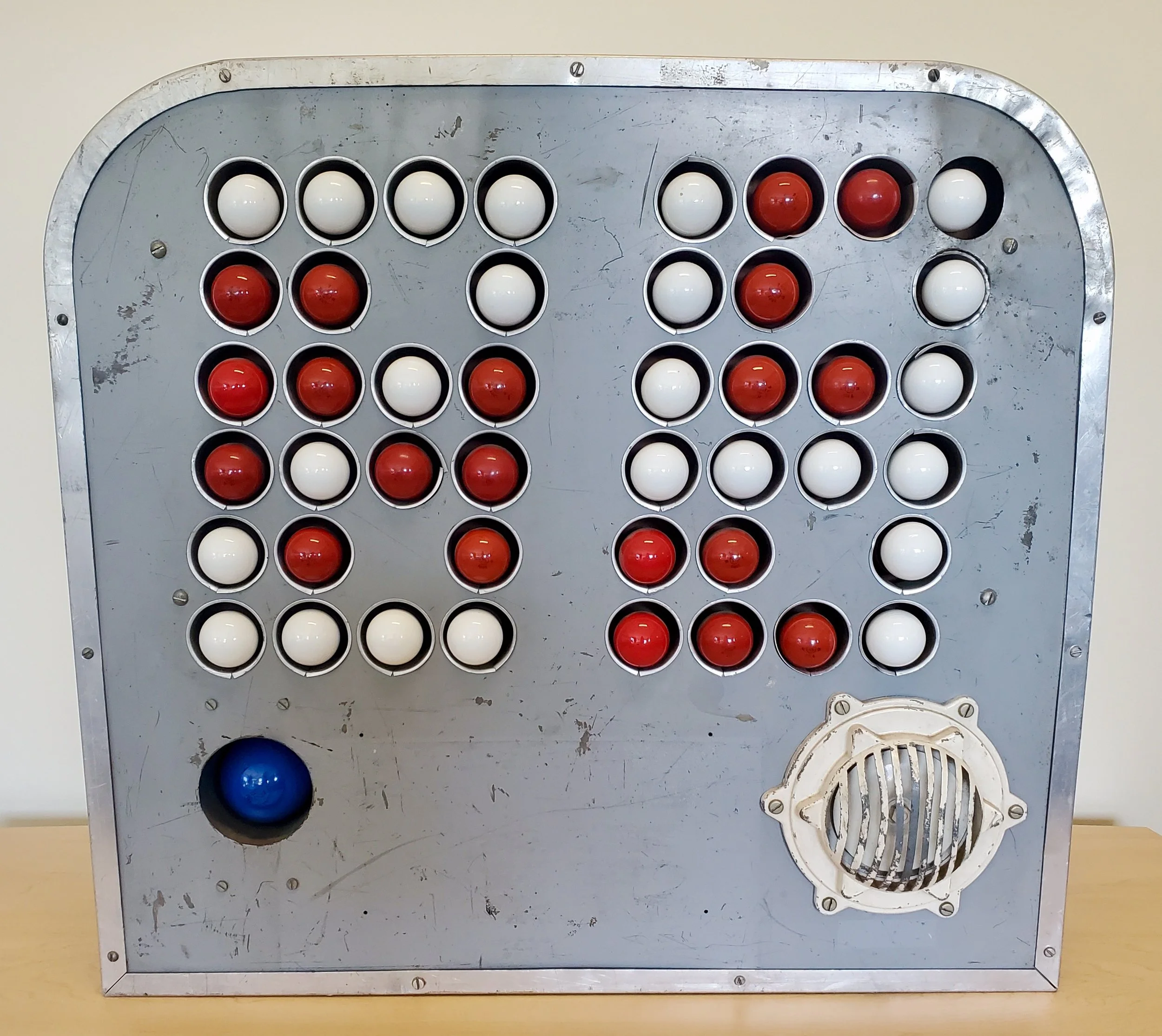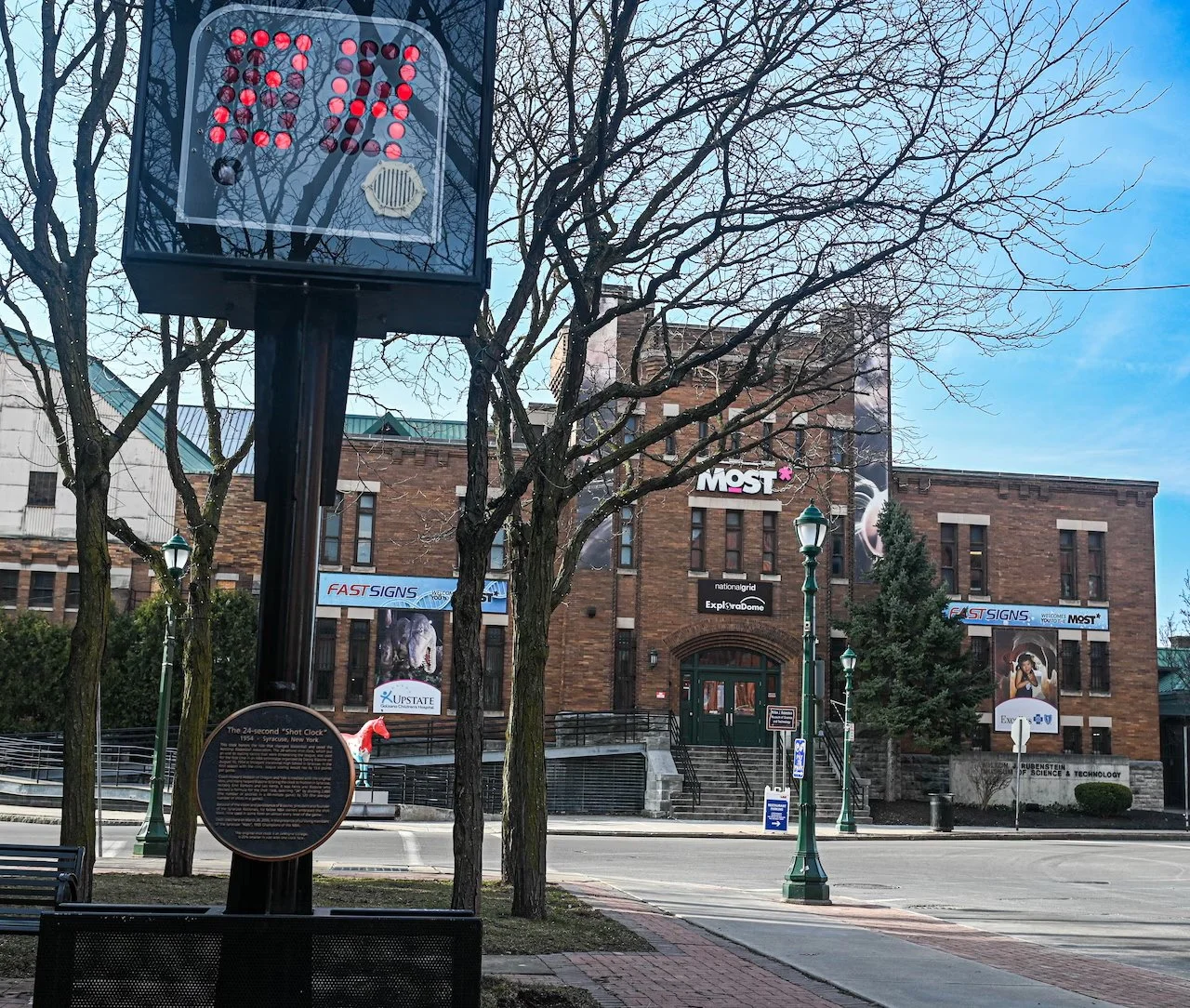You can still see the original shot clock, a weathered aluminum box with a single clock face and 44 red and white bulbs, at Le Moyne College in Syracuse, New York.